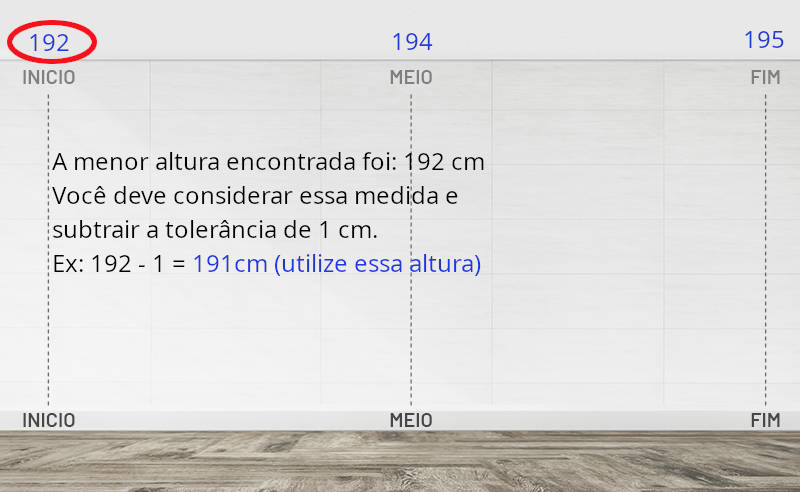 Pedimos que deixe uma tolerância de 1 cm a menos na altura da menor medida encontrada. Veja um exemplo.